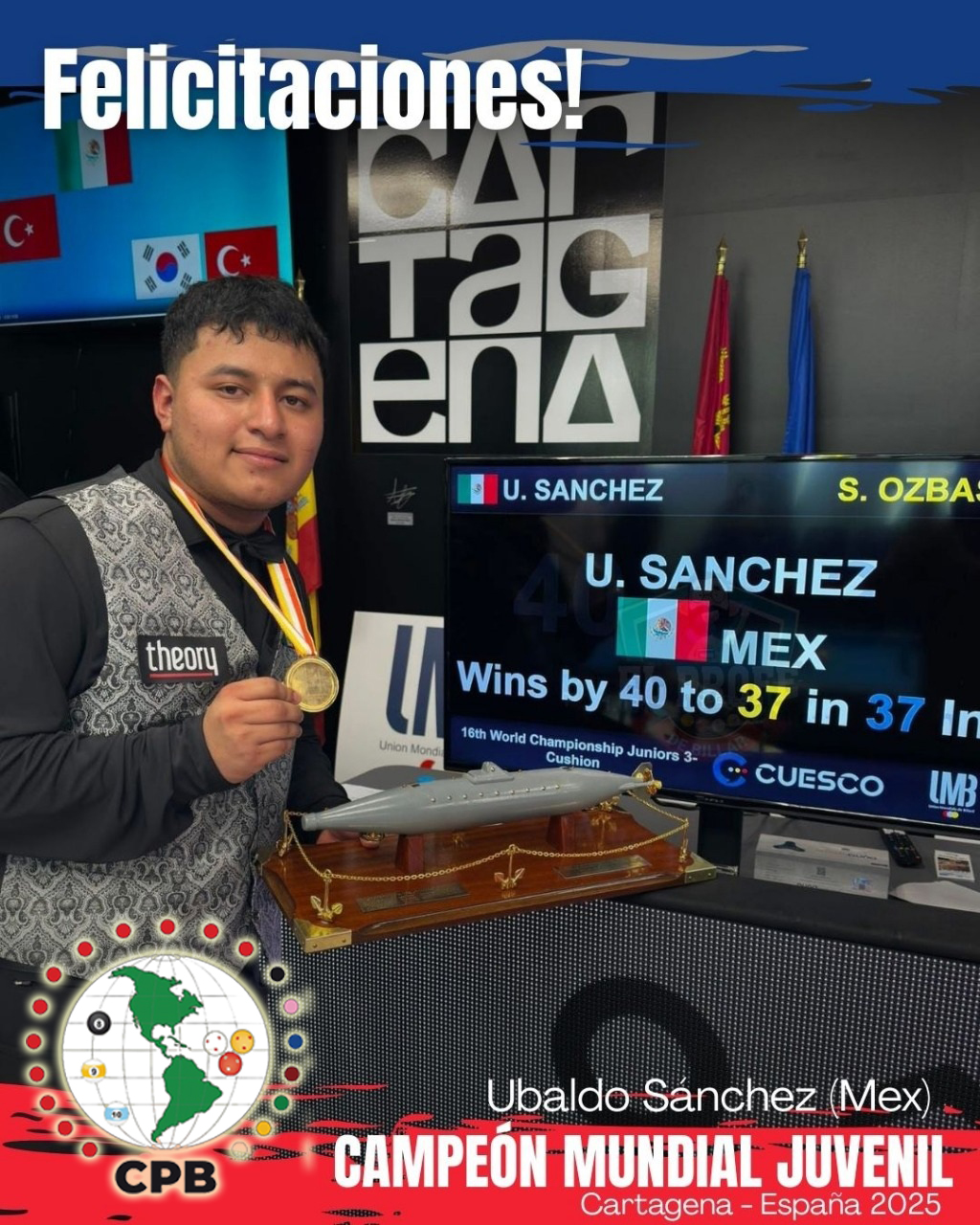 Y se pudo! UBALDO SANCHEZ, Campeón Mundial Juvenil de Tres Bandas 2025. Nuevamente un jugador representando al continente latinoamericano, al continente del habla hispana ya los miles de jugadores de tres bandas en el área panamericana se alza con la Medalla de Oro en los más alto de las competencias del billar mundial juvenil. Ubaldo Sánchez, demostró que el billar mexicano está cosechando la semilla sembrada por la Federación Mexicana de Billar y es el orgullo de toda una nación. CPB felicita al presidente de la FMB Ing. Norberto Sánchez y resto de directivos; a Ubaldo por tan brillante conquista, a su familia, al billar mexicano y en general al billar panamericano que hoy vistió sus mejores galas. VIVA MÉXICO!!!!!!
